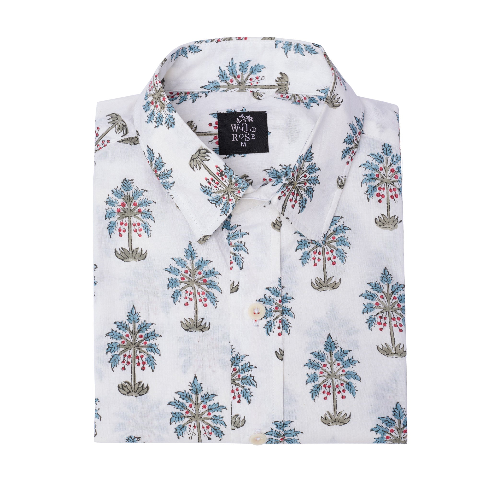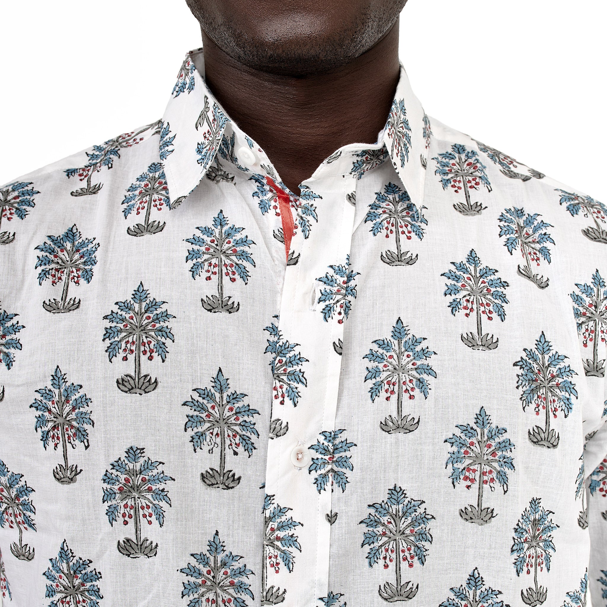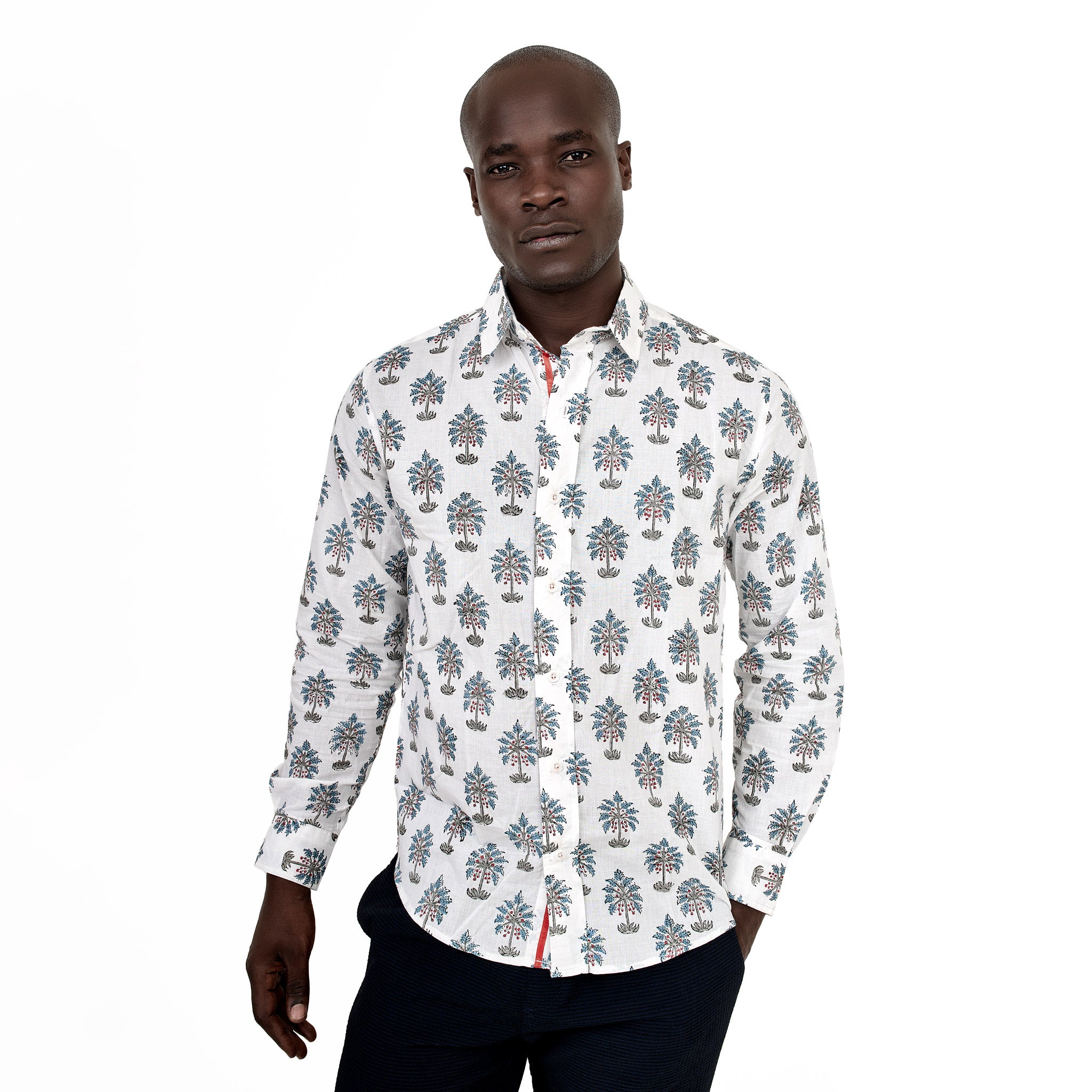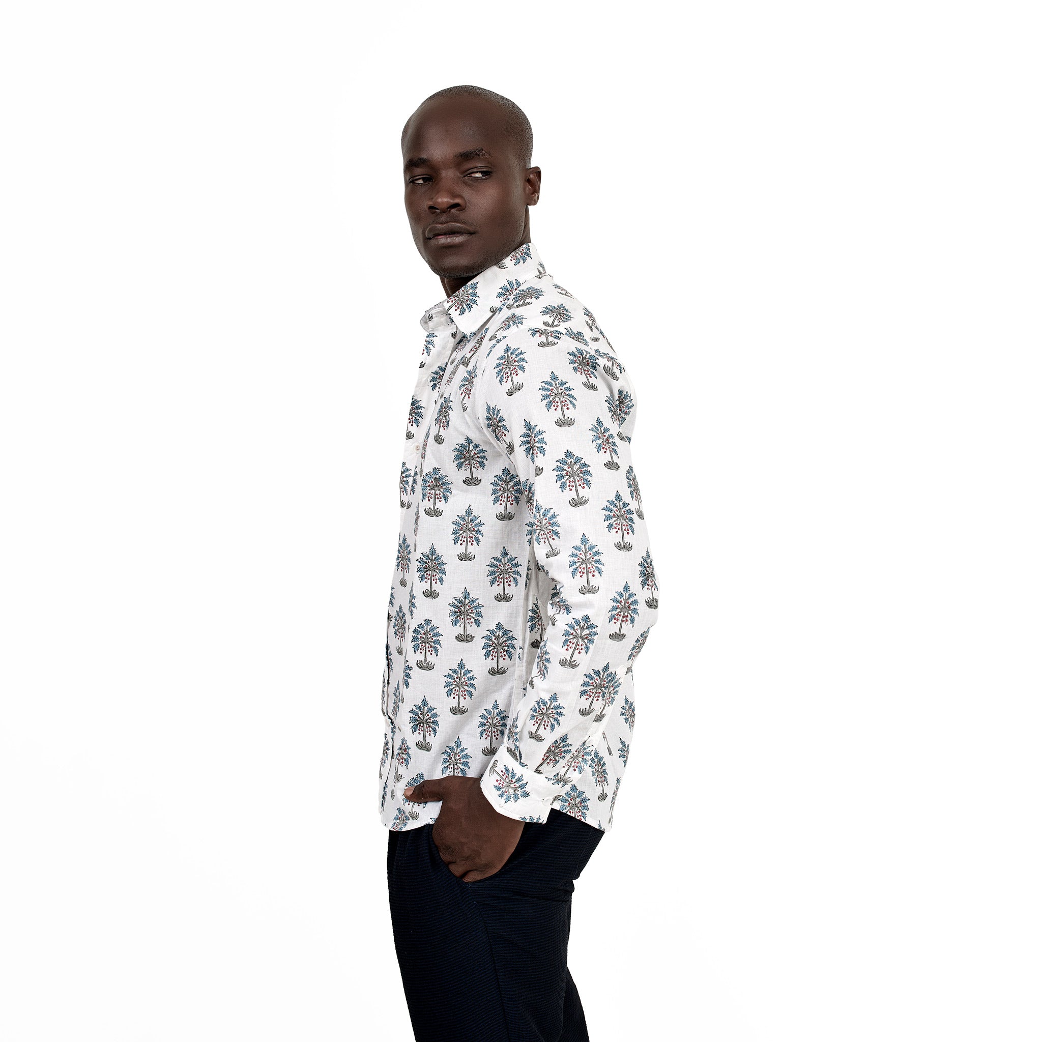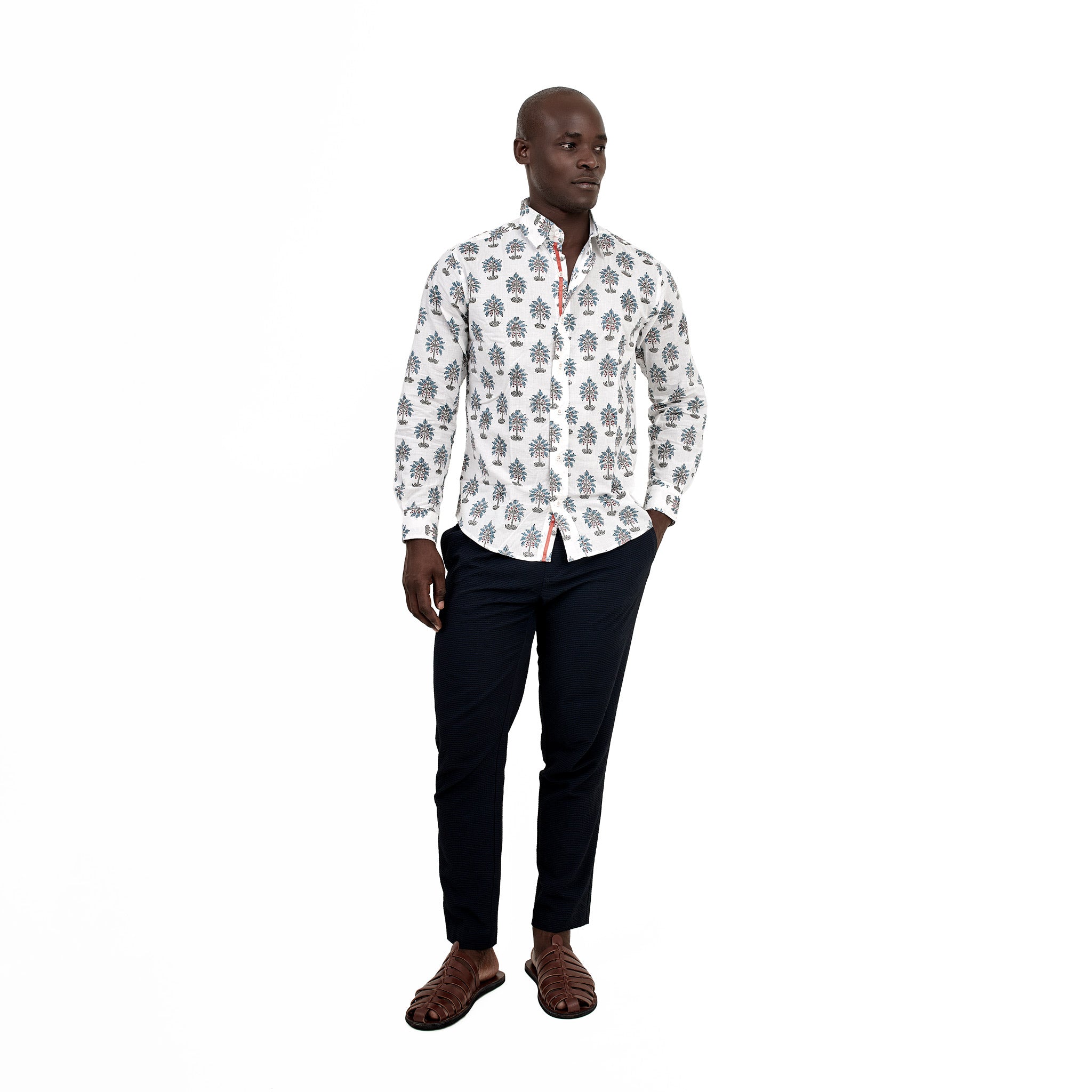 The Mtende Men's Shirt is a fashionable staple inspired by the pristine beaches of Kenya, featuring a crisp white cotton construction, highlighted with a stunning palm print. A perfect choice for smart-casual occasions.