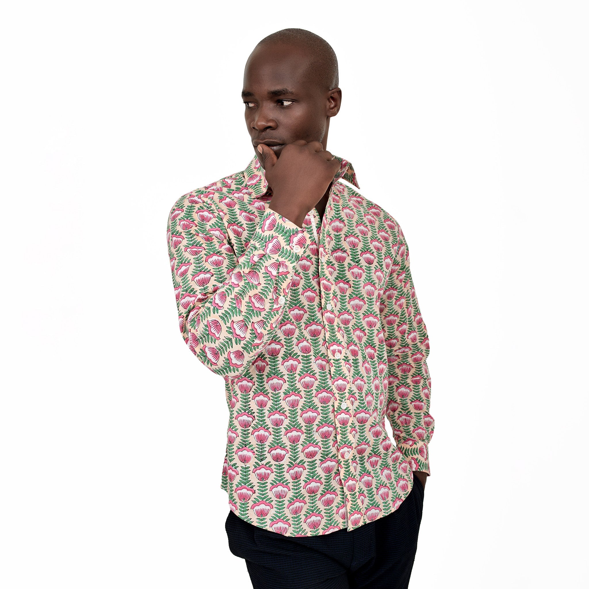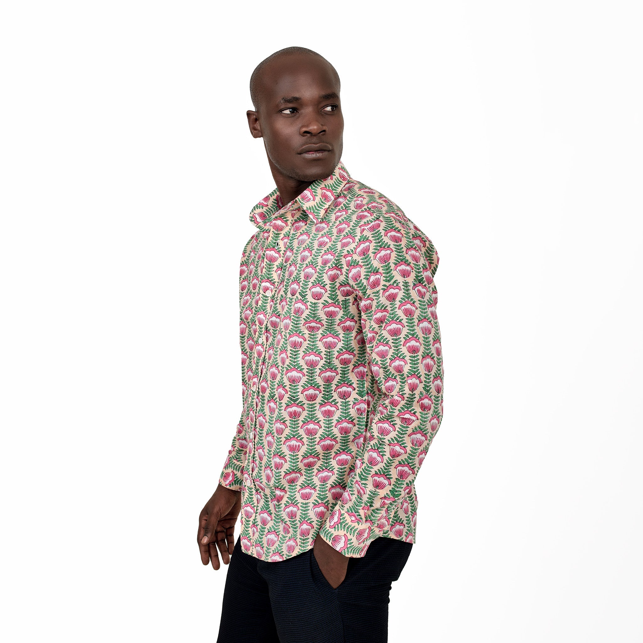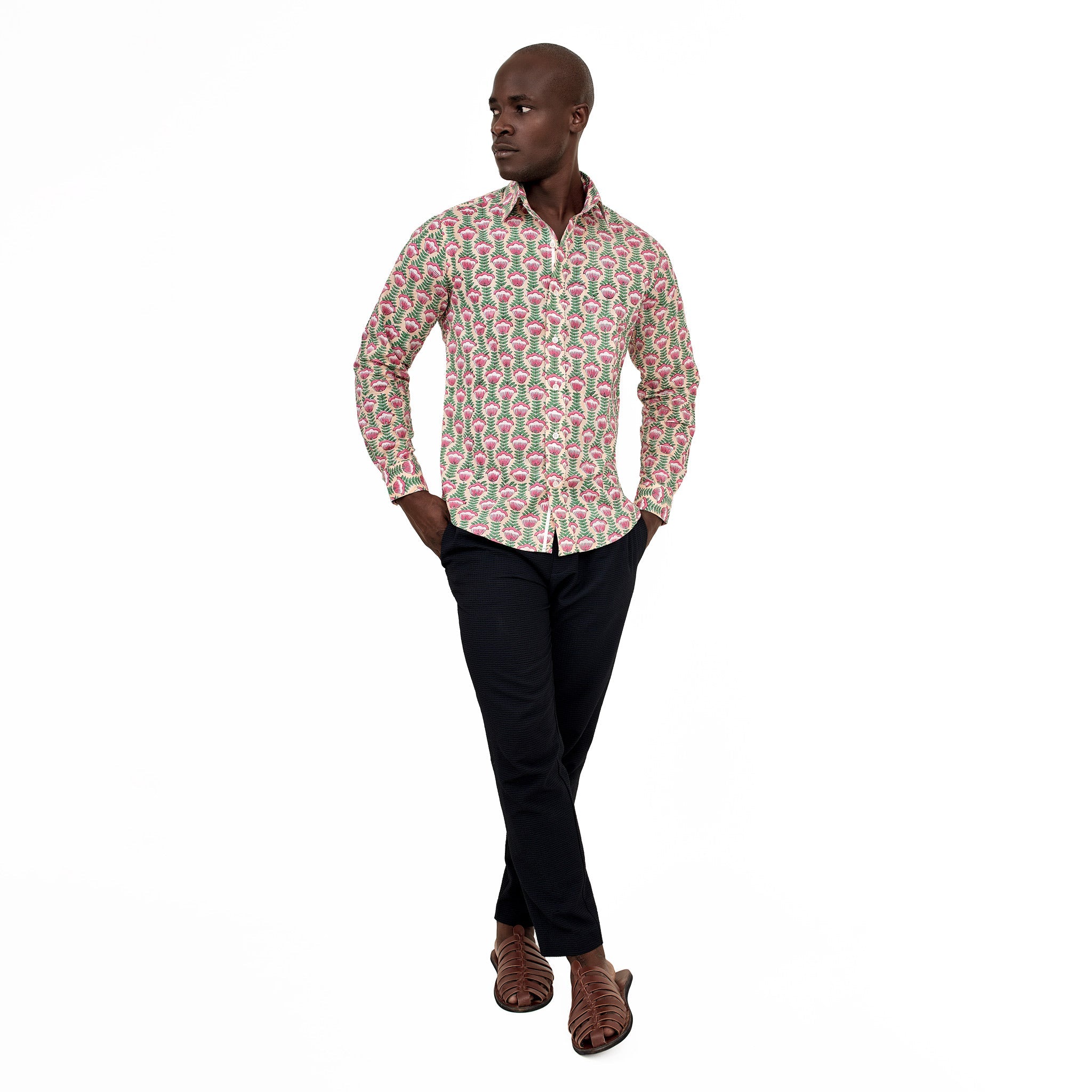 Our Sukari Kichaka shirt is inspired by the the Protea or Sugarbush, one of Africa’s most iconic plants. This shirt in calming green and eye-catching red reflects the protea’s stunning colours.