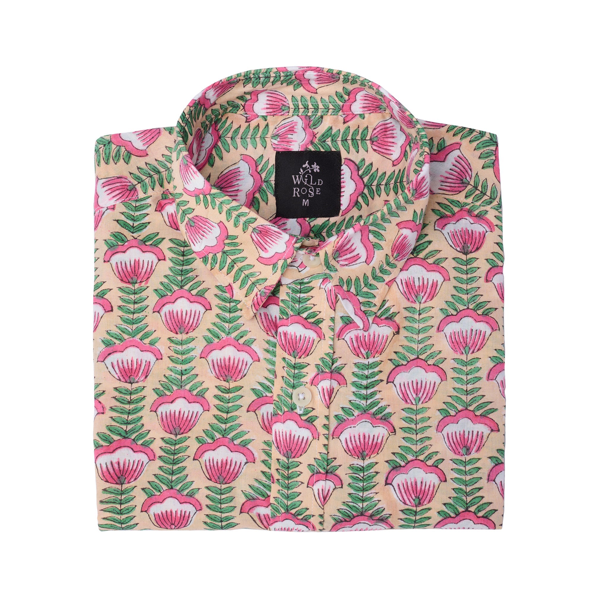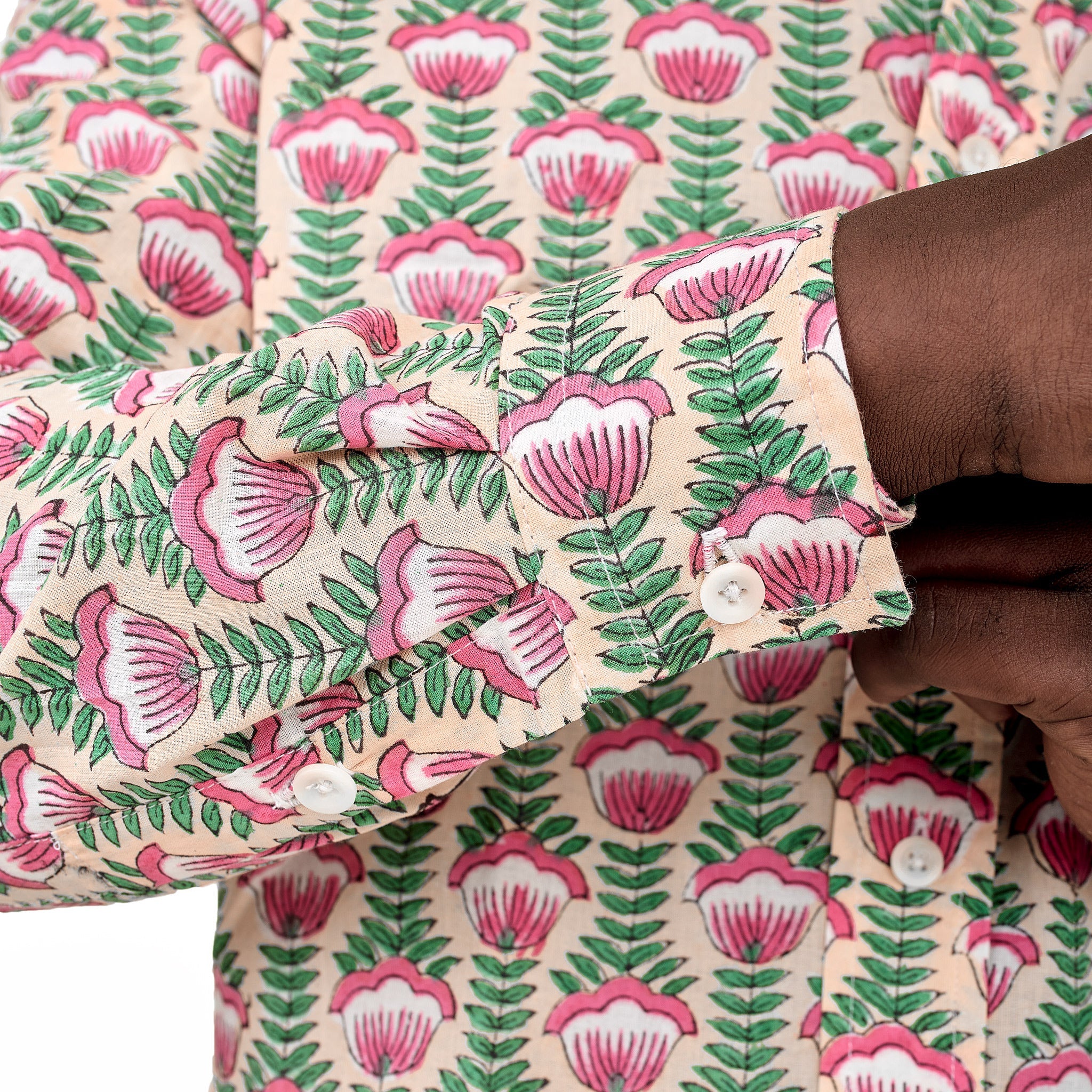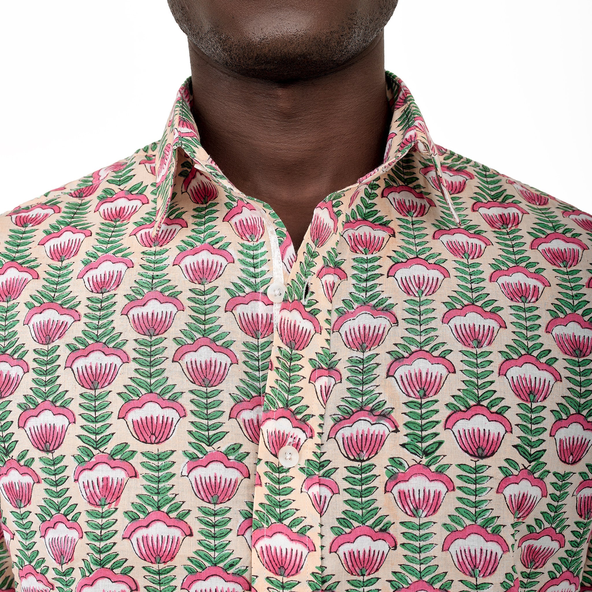 Our Sukari Kichaka shirt is inspired by the the Protea or Sugarbush, one of Africa’s most iconic plants. This shirt in calming green and eye-catching red reflects the protea’s stunning colours.